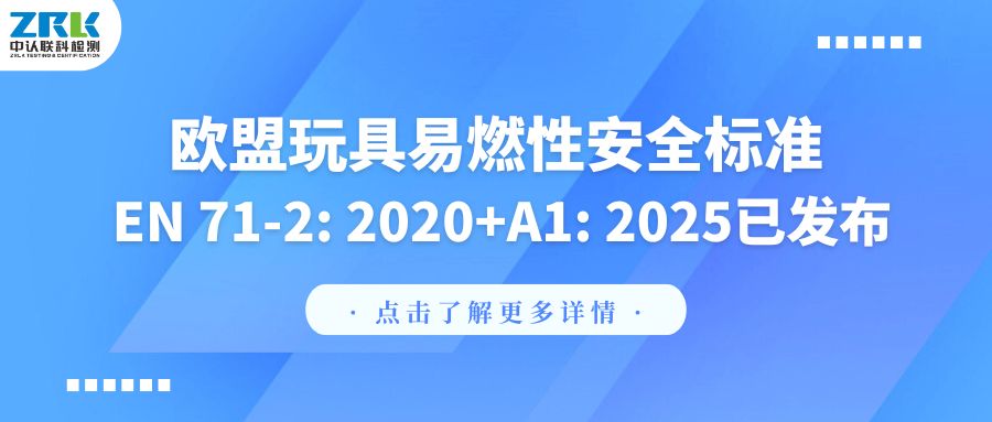 2025年6月11日,歐洲標準化委員會(CEN)發布了玩具安全標準EN 71-2的修訂版 EN 71-2: 2020+A1: 2025 《玩具安全-第2部分:易燃性》。